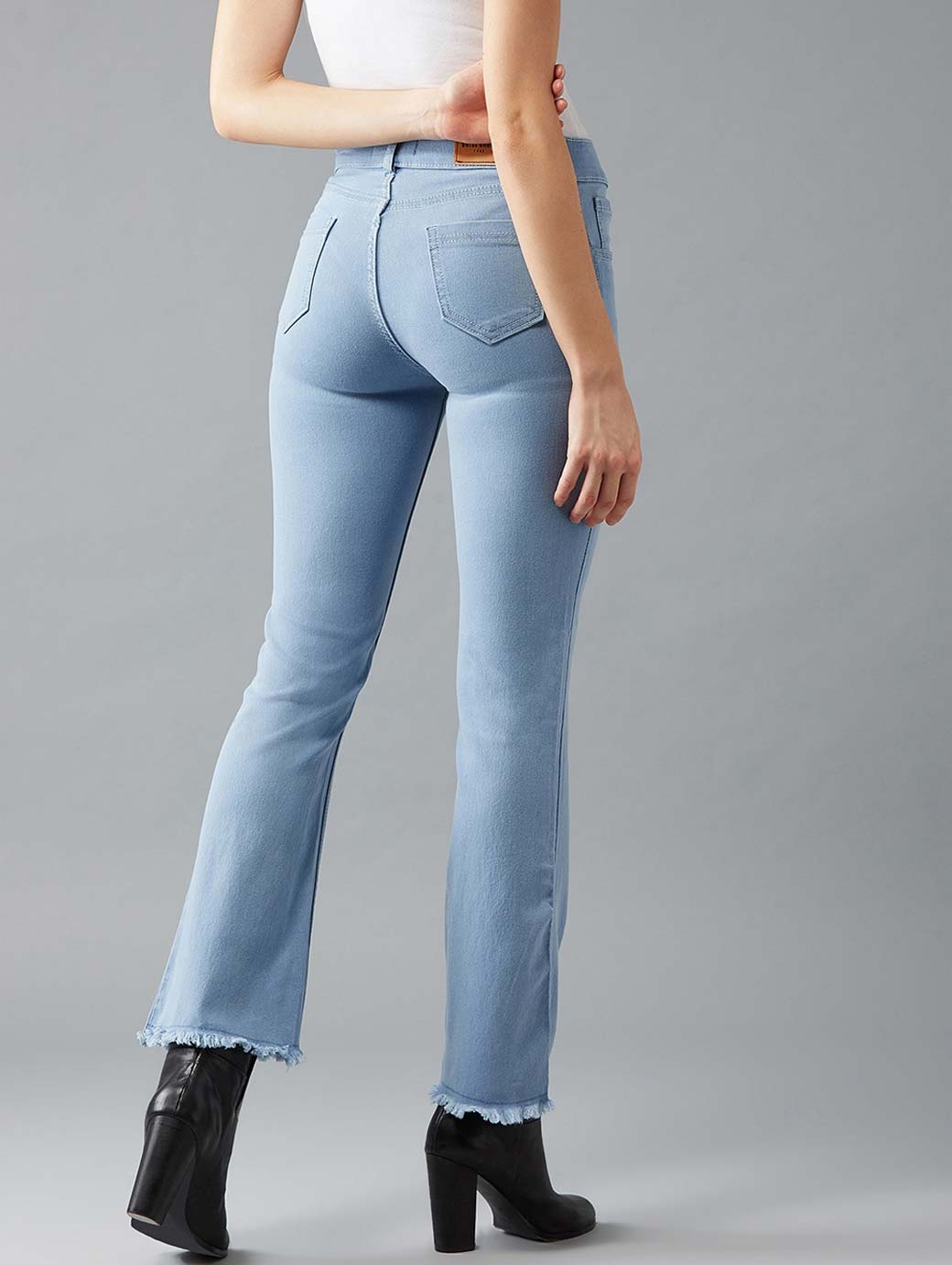 Blue medium wash 5-pocket high-rise jeans, clean look, light fade, has a button and zip closure, and waistband with belt loops