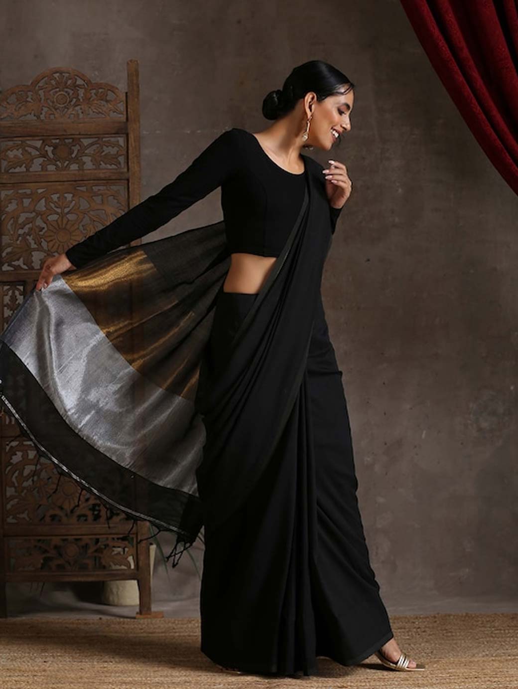 Black & Gold-Toned Pure Cotton Saree